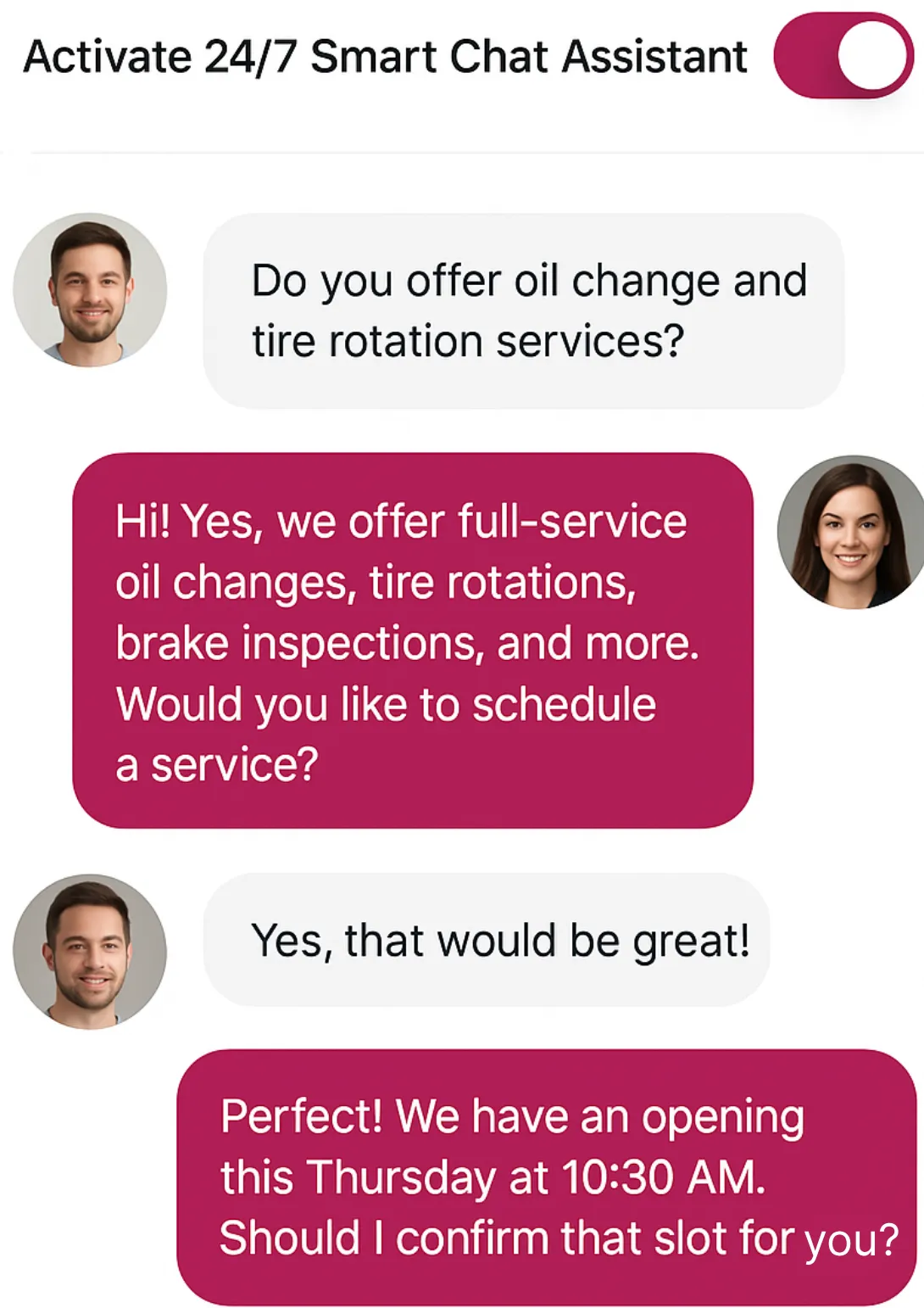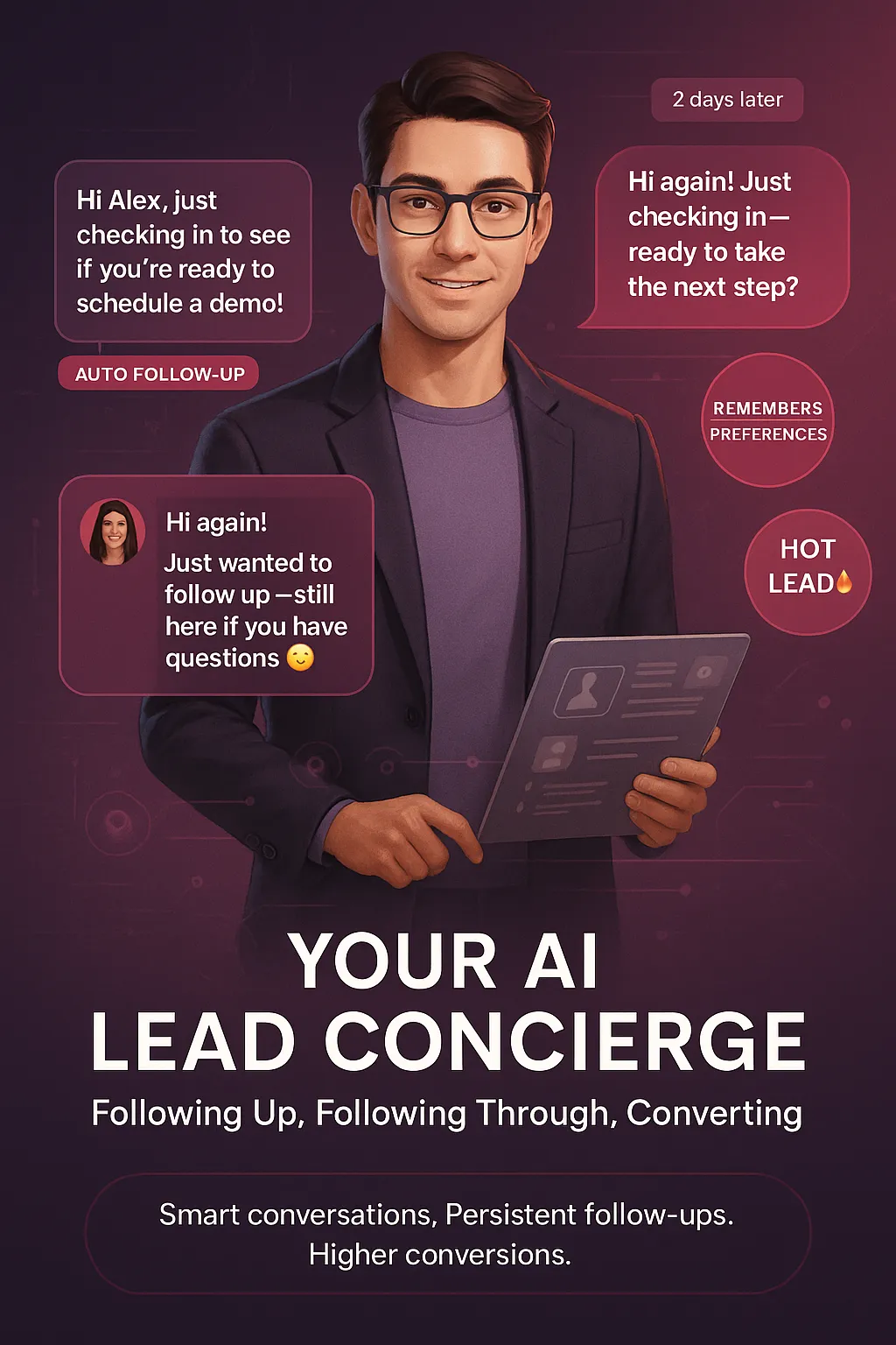 Our AI chatbot acts like a 24/7 digital team member. It answers FAQs, books appointments, captures lead info, and even follows up—all through your website, text, and social media channels.
